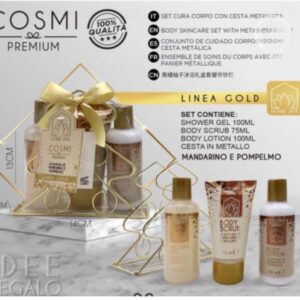 COSMI PREMIUM LINEA GOLD SET CURA CORPO CON CESTA METALLICA. AL PROFUMO DI MANDARINO E POMPELMO. IL SET CONTIENE SHOWER GEL 100ML, BODY SCRUB 75 ML E BODY LOTION 100 ML
