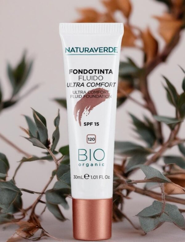 NATURA VERDE. Fondo tinta fluido n 120, 30 ml. Texture leggera e confortevole. Formula idratante e nutriente. Copertura perfetta per ogni tipo di pelle. Effetto duraturo con acido ialuronico. SPF 15 NON CONTIENE NICHEL.