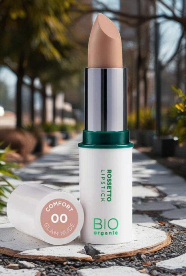 NATURA VERDE. ROSSETTO 00 GLAM NUDE ULTRA COMFORT COLORE PIENO ED INTENSO IDRATANTE E NUTRIENTE. 100% INGREDIENTI DI ORIGNINE NATURALE DI CUI 48,47% DI INGREDIENTI BIOLOFICI NO PARABENI MADE IN ITALY