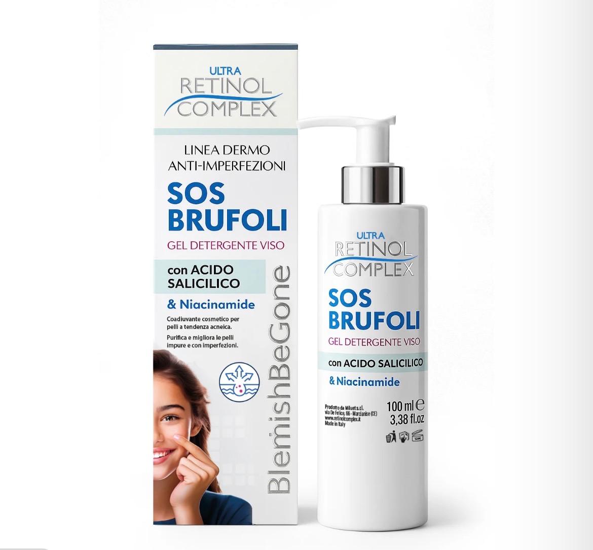 II Gel Detergente SOS Brufoli Retinol Complex®️ è formulato per offrire una detersione profonda